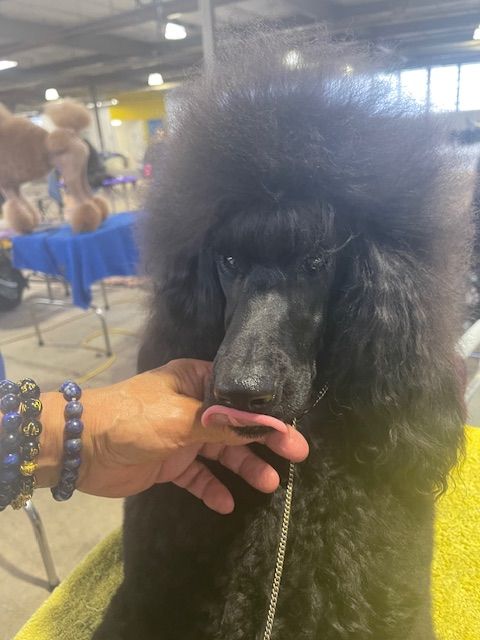 Atalie is a gorgeous affectionate girl that I imported from Spain 🇪🇸. Atalie's pedigree is comprised of several well known and respected Standard Poodle lines like Huffish and Afterglow. Atalie has a nice rich jet black coat, nice reach and stride when she prances around the ring. At 6 months old she already self stacks when she is out and about in the yard playing with the other dogs - a natural for the show ring. I am excited to see how she continues to develop and see what she will accomplish during her journey to AKC Championship.